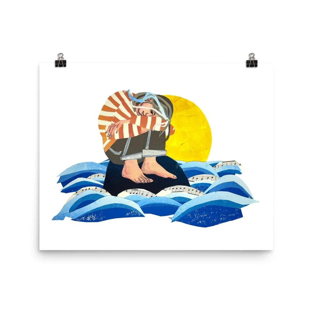 This is a print of a cut paper collage by Jes Raymond. The artwork stands out from any angle as the matte museum-quality paper diffuses the light. These are unsigned Giclée-quality reproduction prints.