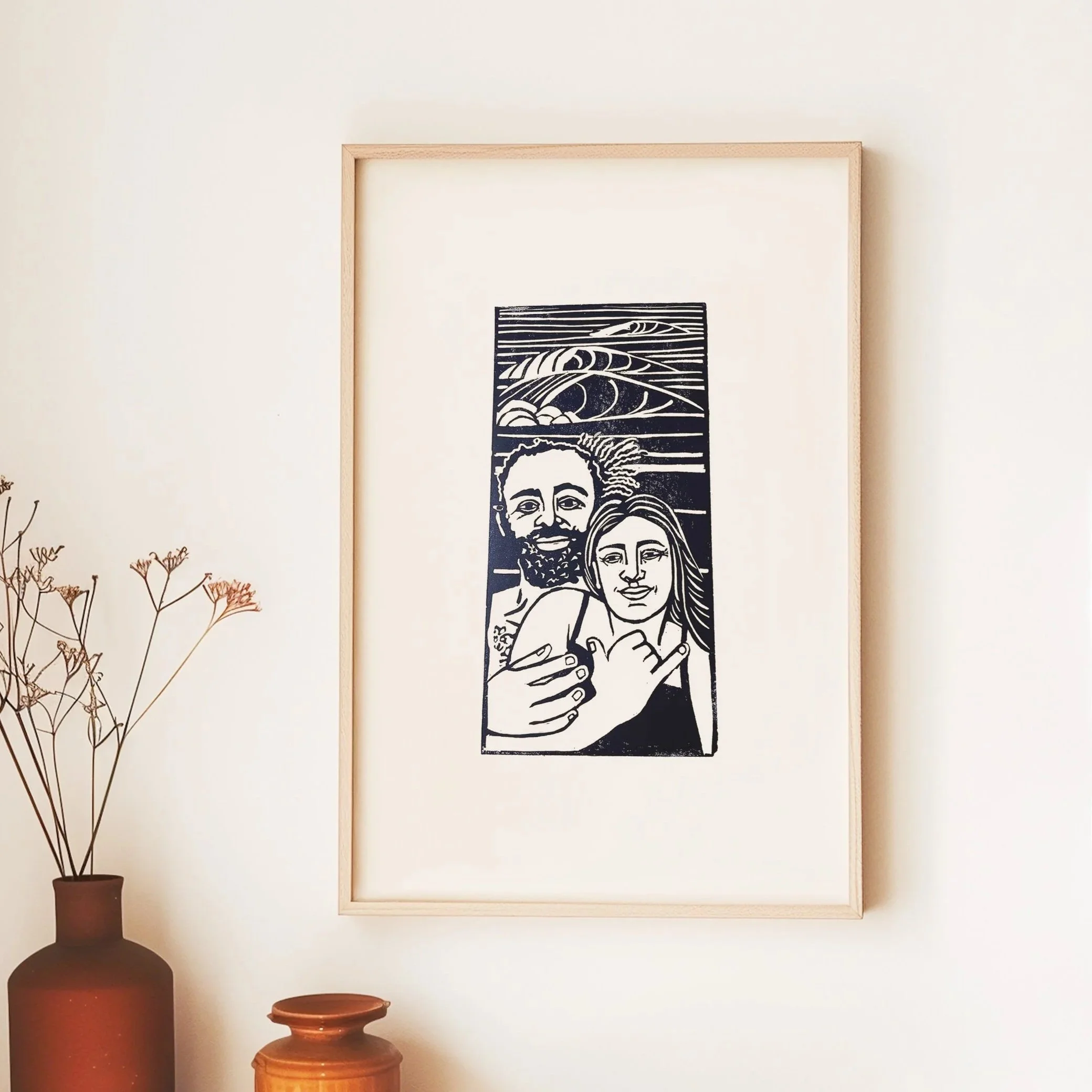 An artful custom portrait completely made by human hands and mind! Linocut art is a beautiful way to celebrate or commemorate! Perfect for Holidays, Engagements, Weddings, Anniversaries, Family Portraits, and Celebration of Life ceremonies. We work together to make a timeless piece that tells your story. Linocut printmaking also makes it easy to affordably share the original art with many people.